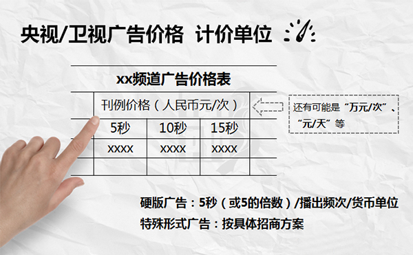 1、央視廣告價(jià)格的計(jì)費(fèi)單位?硬廣為5秒(或5的倍數(shù))/播出頻次/元,特殊形式廣告按具體招商方案。