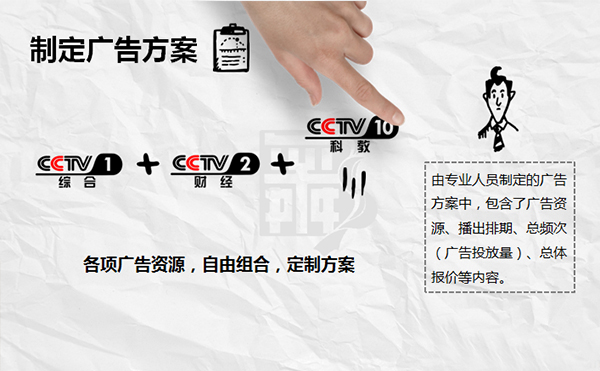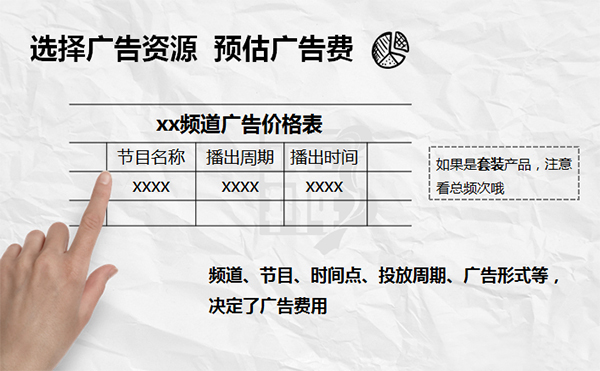 3、如何預(yù)估廣告預(yù)算?客戶可先查看央視廣告價(jià)格表,挑選想投放的頻道與時(shí)間點(diǎn),并告知我們選擇的廣告資源及投放周期,我們?yōu)榭蛻纛A(yù)估廣告價(jià)格和廣告投放量,作為客戶制定預(yù)算時(shí)的參考。