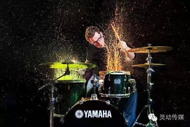 以擊鼓的物理效應(yīng),讓彩色顏料飛濺而上,再以高速閃燈拍攝捕捉瞬間